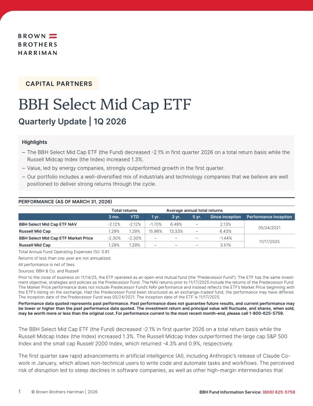 The BBH Select Mid Cap ETF (the Fund) decreased -2.1% in first quarter 2026 on a total return basis while the Russell Midcap Index (the Index) increased 1.3%. The Russell Midcap Index outperformed the large cap S&P 500 Index and the small cap Russell 2000 Index, which returned -4.3% and 0.9%, respectively.